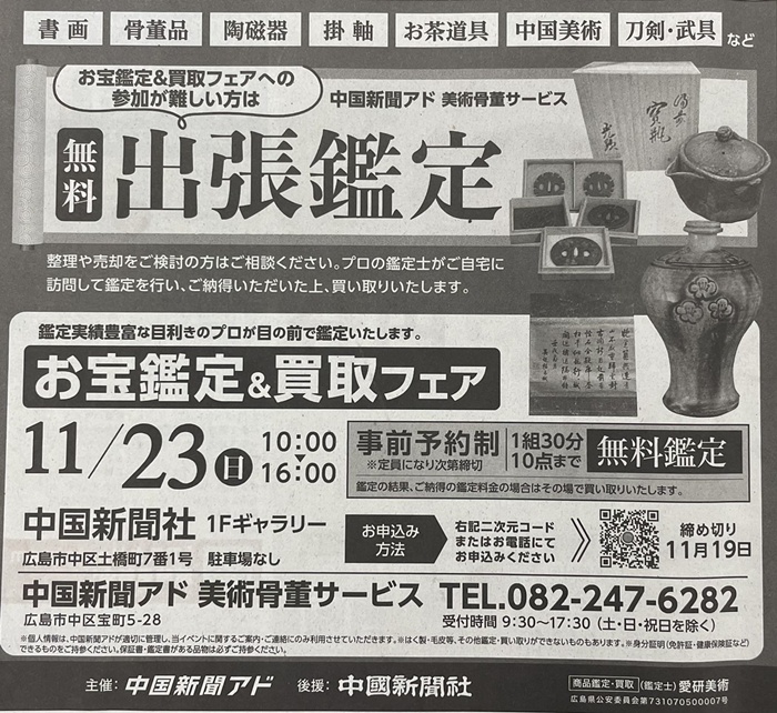 広島県内及び広島県近郊の出張査定、鑑定、見積無料です、また持込も歓迎しますのでお気軽にお問い合わせ下さい!