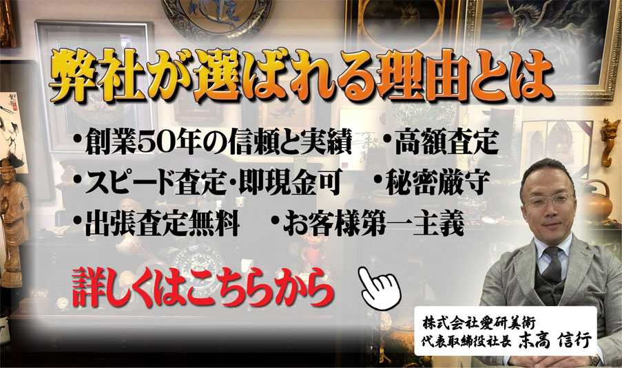 ㈱愛研美術の骨董品や美術品の査定・鑑定・買取に関しましては、年間1,200件・30万点以上(通算1万5,000件・のべ300万点以上)の買取、行政機関(県・市役所)様や各士業(弁護士、司法書士、公認会計士、税理士、行政書士)様のご依頼での査定・鑑定や、公売物件の基準価格の作成、相続時の家財品評価証明書の発行、教育文化施設(NHKカルチャーセンター、商工会議所など)での鑑定会や講演会の実施、メディア(テレビ・ラジオ)の鑑定番組への出演、チャリティーオークション開催など、多数の実績があります。