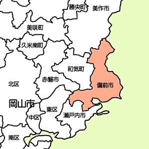 岡山市 倉敷市 笠岡市 備前市 瀬戸内市 総社市 高梁市 玉野市 津山市 赤磐市 新見市 浅口市 真庭市 美作市和気郡 井原市 英田郡 小田郡
